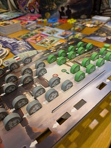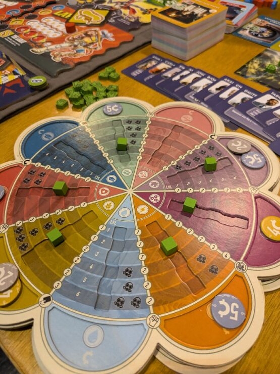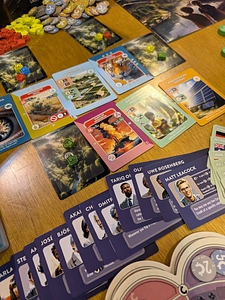 Each player has their own country board with their own special ability, where they track their economy and their population's need fulfillment. Increasing the fulfillment levels of certain needs will unlock more and more powerful rewards, but at the same time threatens to create additional pollution.