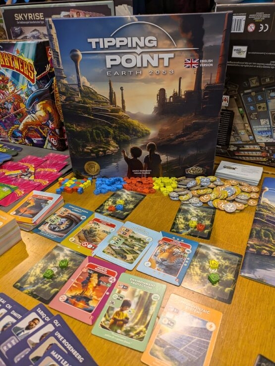 In Earth 2053: Tipping Point, players represent countries that work together to prevent a global climate catastrophe. The main scoring happens on a physical seesaw board where "prevention" tokens are placed on one side and "pollution" tokens on the other. Filling the prevention side lets all players win (with optional placements based on who contributed the most). However, if the board tips towards the pollution side, all players lose.