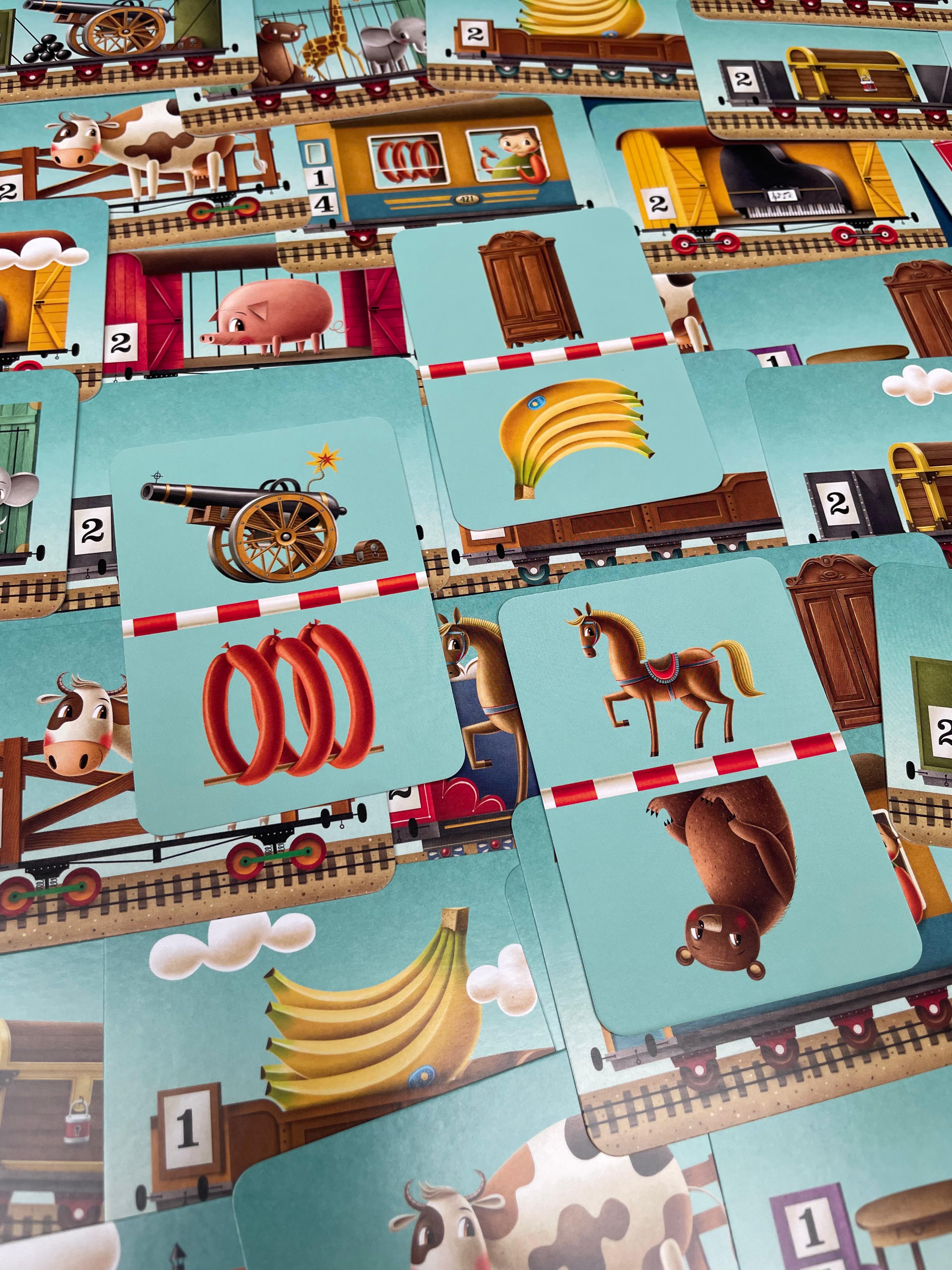 W pudełeczku znajduje się 47 kart wagonów i ładunków – są dwustronne, z jednej strony każdej karty jest wagon, a z drugiej ładunek. Są 4 też karty lokomotyw i 4 karty z fragmentami wiersza Tuwima, które wyznaczają zbliżający się koniec gry.