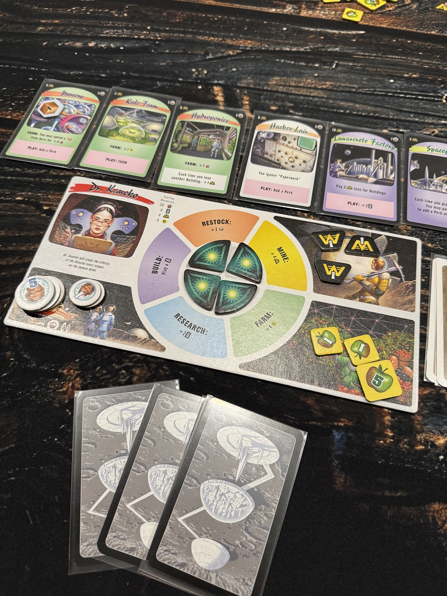 This is an engine-building engine-losing tableau game, with a shared deck the players build that makes things happen, many of them bad things that kill people in your moon colony, but some positive, and some that let you build up. The game lasts until one player’s moon colony has no people left in it, or the players reach the bottom of the Event deck; the player with the most survivors wins.