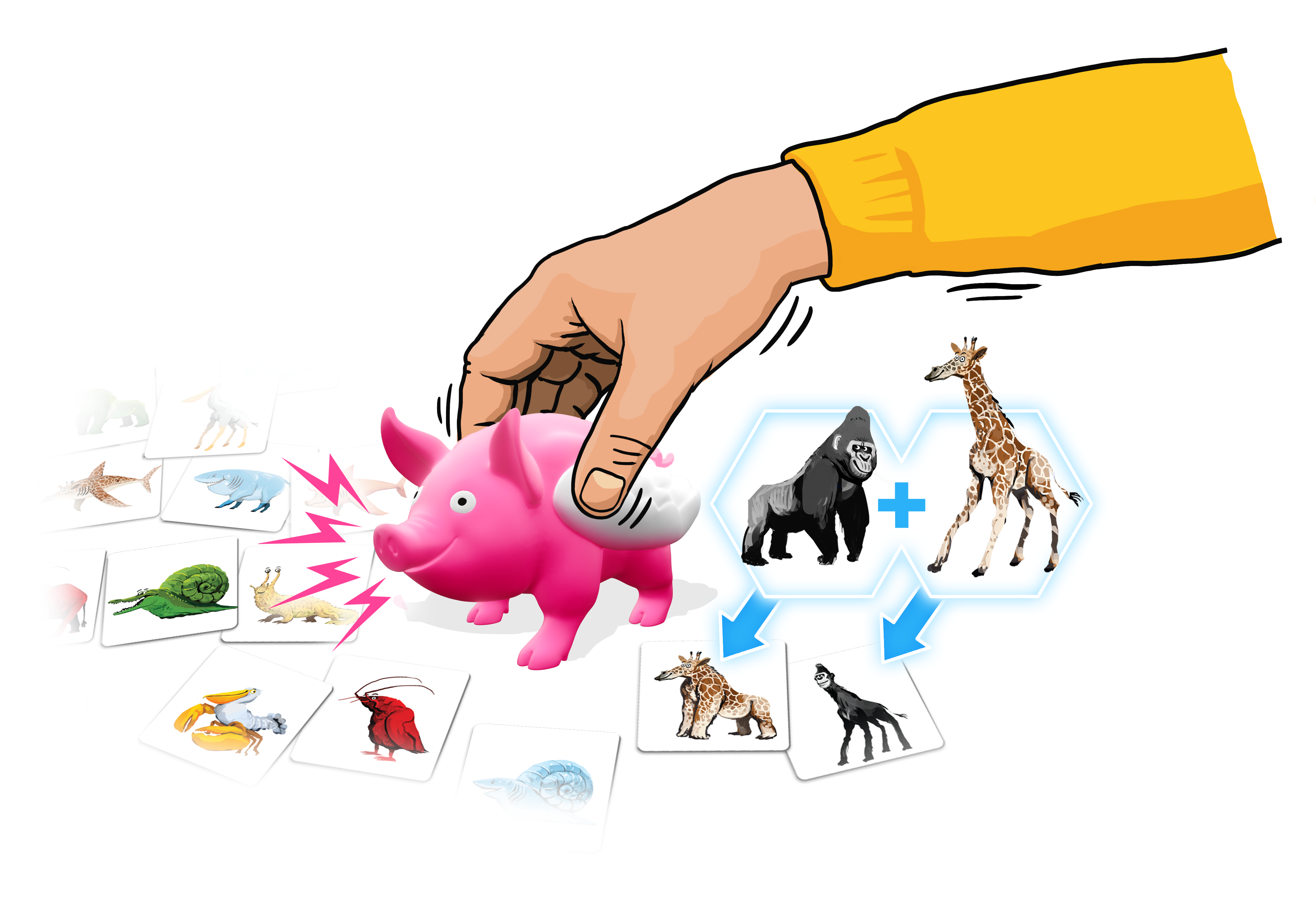 Czy to żyrafa, czy goryl? A może jedno i drugie? W tej dynamicznej grze liczy się szybka reakcja! Gracze muszą znaleźć pary kart, na których widnieją zabawnie pomieszane zwierzęta. Wygrywa ten, kto zbierze ich najwięcej. Ale uwaga – trudno powstrzymać śmiech na widok tych niezwykłych stworzeń! Skup się, miej bystre oko i zbierz jak najwięcej par, nie dając się rozbawić dziwacznym kombina...
