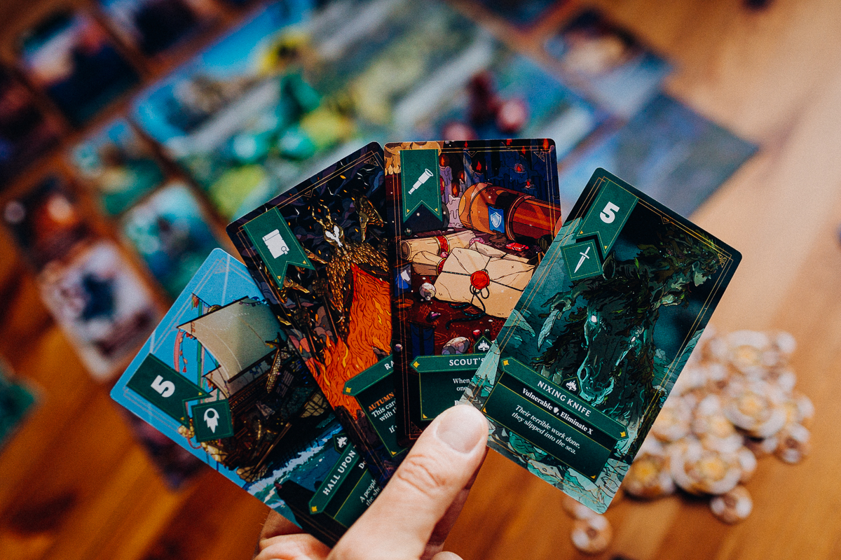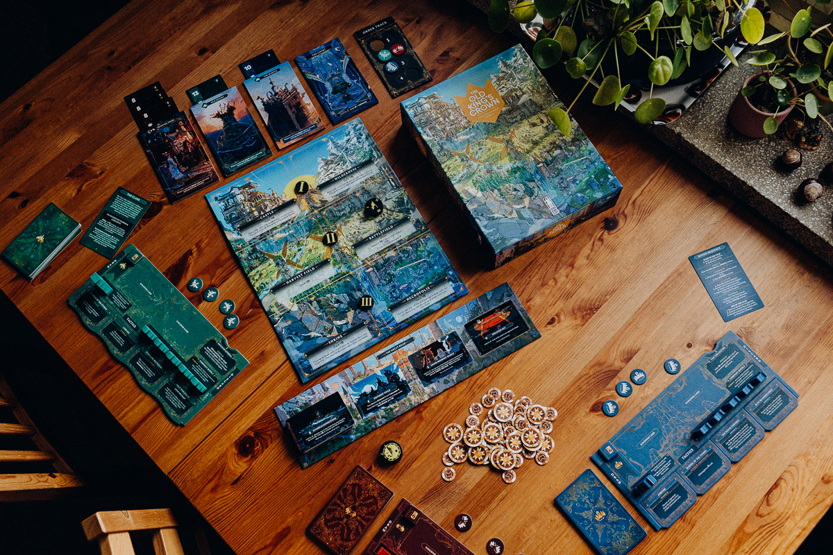 Sednem „Korony Starego Króla” są zakryte zagrania. W każdej rundzie planujemy swoje działania, zagrywamy karty do regionów i… czekamy. Moment odkrywania kart jest jednym z najbardziej ciekawych elementów gry. Czasami wszystko zagra idealnie i czujemy satysfakcję z dobrze przewidzianych ruchów przeciwników, a czasami cała strategia rozsypuje się w jednej chwili.
