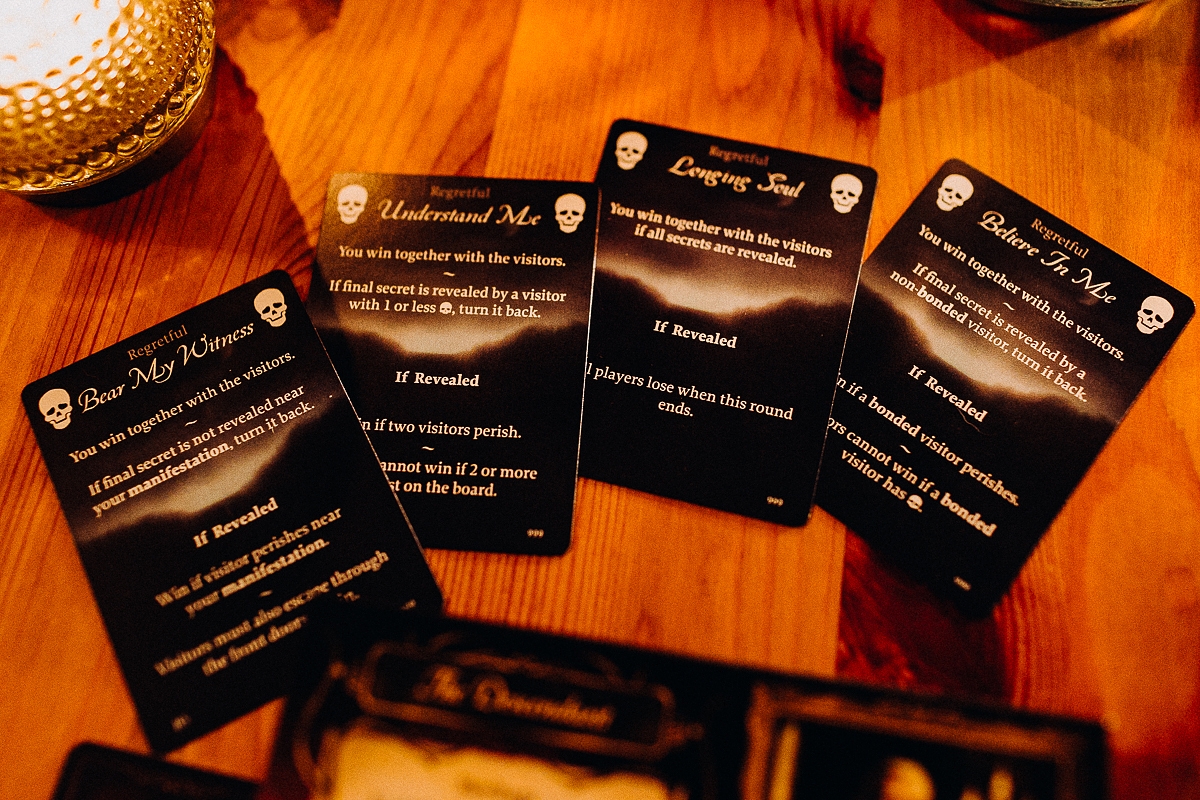 The game is for 2-5 players where one player plays as a spirit with unknown intentions. The others play as the visitors, who need to work together to determine whether the spiri...