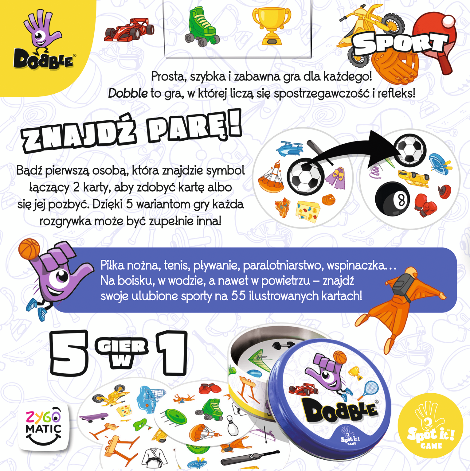 Spójrz na pierwszą kartę, którą trzymasz w ręku oraz na tę, która leży na środku stołu. Znajdź na nich wspólny symbol, nazwij go i szybko pozbądź się swojego kartonika. Teraz następny! Tylko nie zwątp, każda karta łączy się z inną zawsze tylko jednym symbolem!  Dobble Sport to nowa odsłona popularnej gry karcianej, w które staramy się znajdować pary identycznych symboli zanim zrobią to p... czytaj dalej