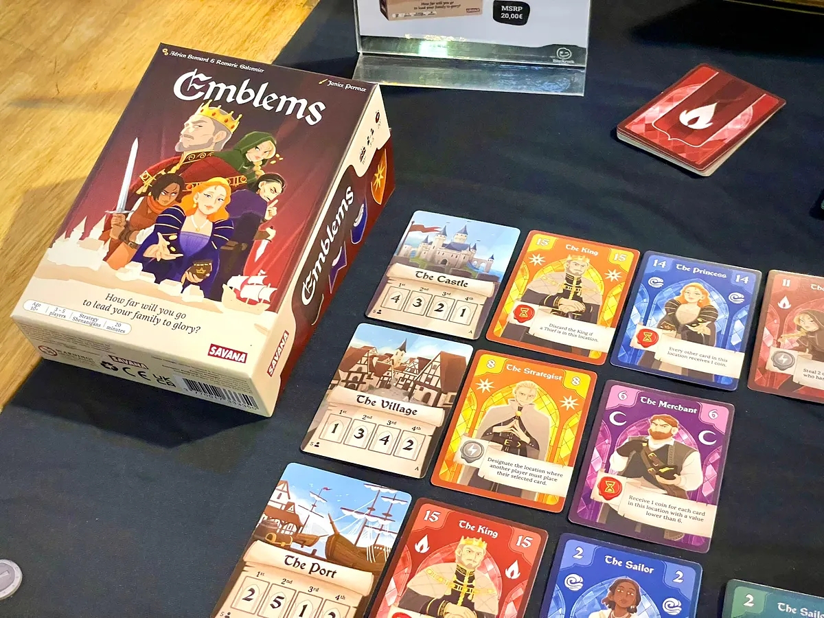Opis w języku angielskim: Emblems is a card game that blends strategic thinking, opportunistic placement and sneaky moves! At the start of each turn, choose a card, taking into account its value and effect, before placing it face down in front of you. Then, one after another, reveal your card and place it in one of the three locations: the Castle, the Village or the Port. At the end of e...