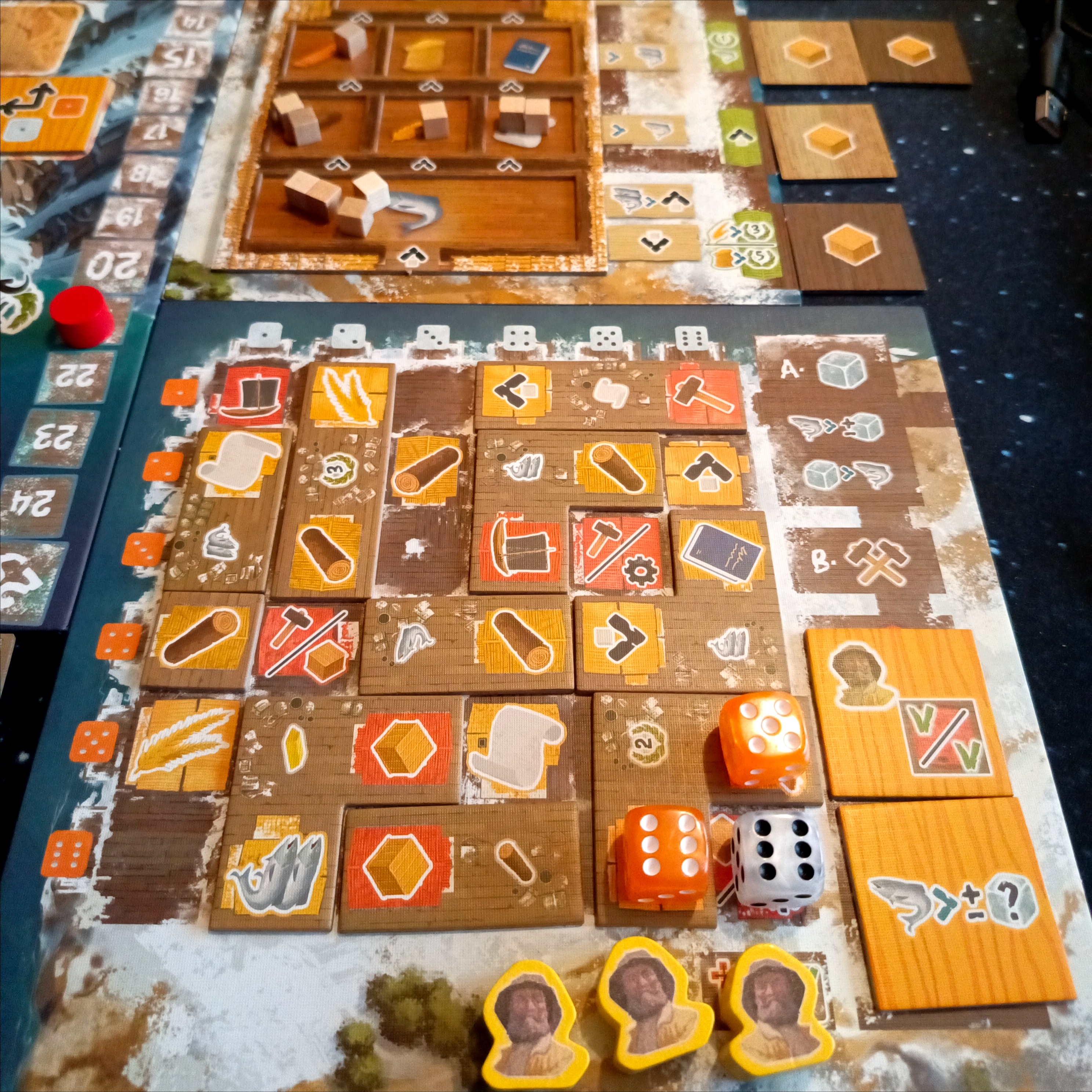 Wrażenia: Jak sie to wszystko zobaczy to można dostać lekkiego bólu głowy, ale potem okazuje się, że w sumie zasady i gra sobie płynie. Mam jednak wrażenie, że mimo wielu opcji poczatkowo trzeba rozbudować swoja wioskę, bo potem już sie tego nie nadrobił. Niemniej gra podobała mi się, fajnie rozwiazano drzewo wymiany zasobów. Ciekawy jest wyścig na torach "usprawnień". Generalnie sporo sie dzieje i dośc szybko płynie czas.